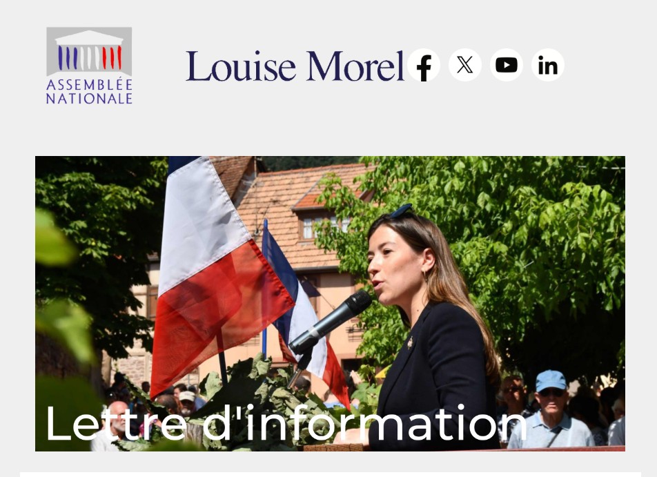 Si vous souhaitez la recevoir directement par courriel, il vous suffit d’en faire la demande à l’adresse suivante : louise.morel@assemblee-nationale.fr, ou via le formulaire disponible sur mon site : https://louisemorel.fr