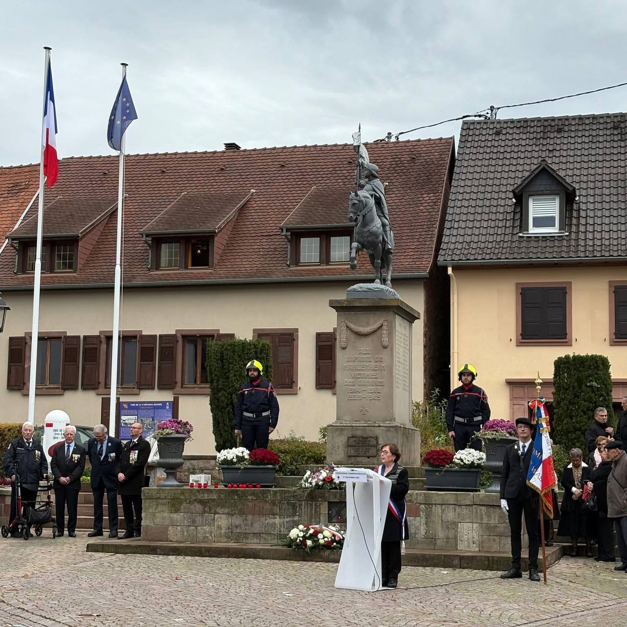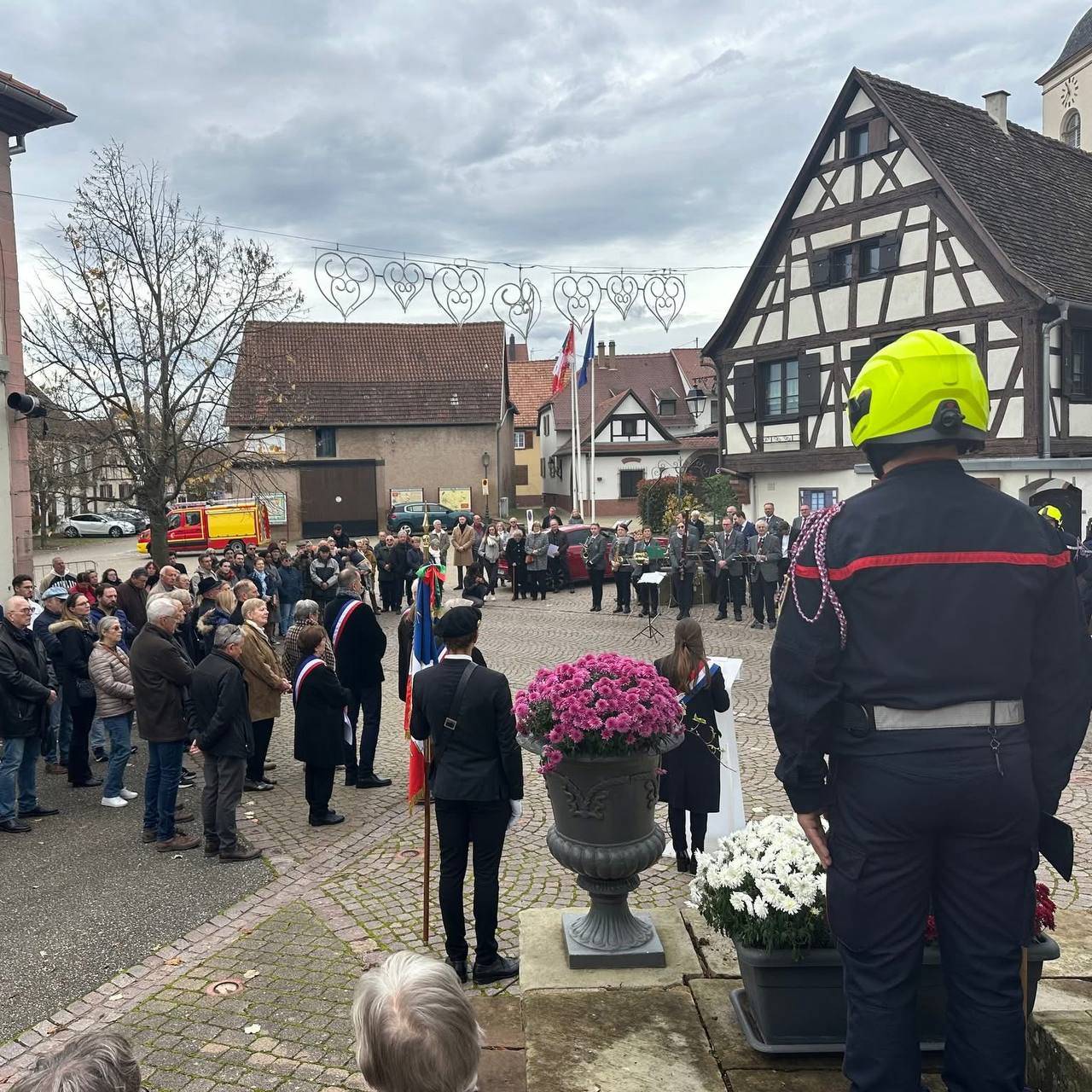 Ici, à Marlenheim, devant ce monument aux morts, nous rendons hommage à vos enfants : aux pères, fiancés, enfants, frères, amis — tous ceux qui ont donné leur vie pour que la nôtre demeure libre. Leur nom, gravé dans la pierre, nous rappelle que la mémoire ne se vit pas qu’un jour par an : elle palpite chaque jour au cœur de nos cités, comme un souffle silencieux.